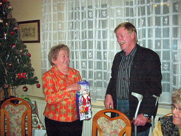 Die Weihnachtsfrauen (Eveline Getschmann und Ingelore Friedrich) hatten für alle nicht nur ein kleines Geschenkpaket, sondern auch ein Späßchen parat.