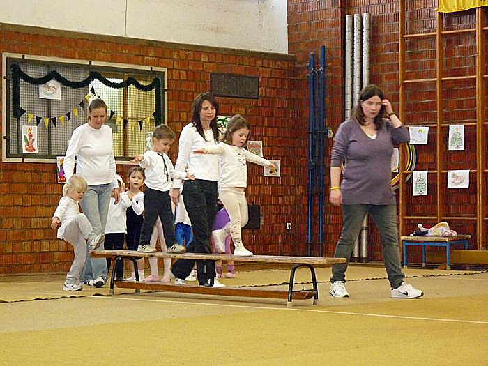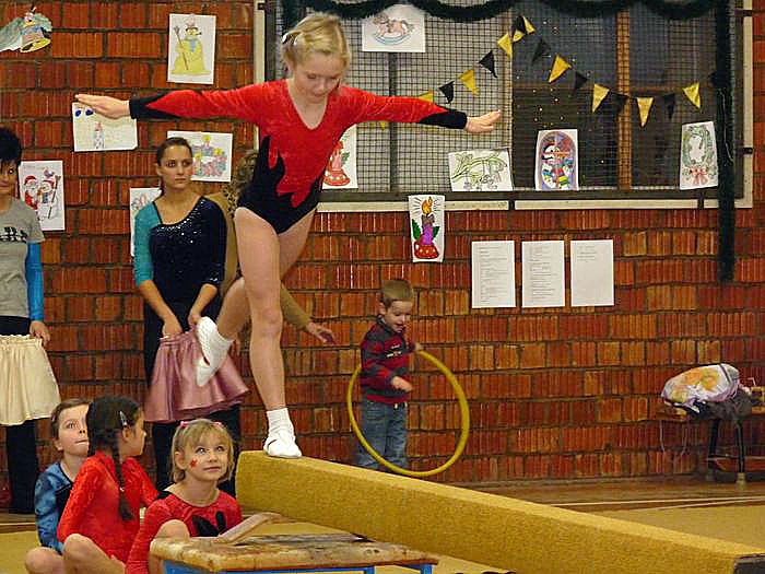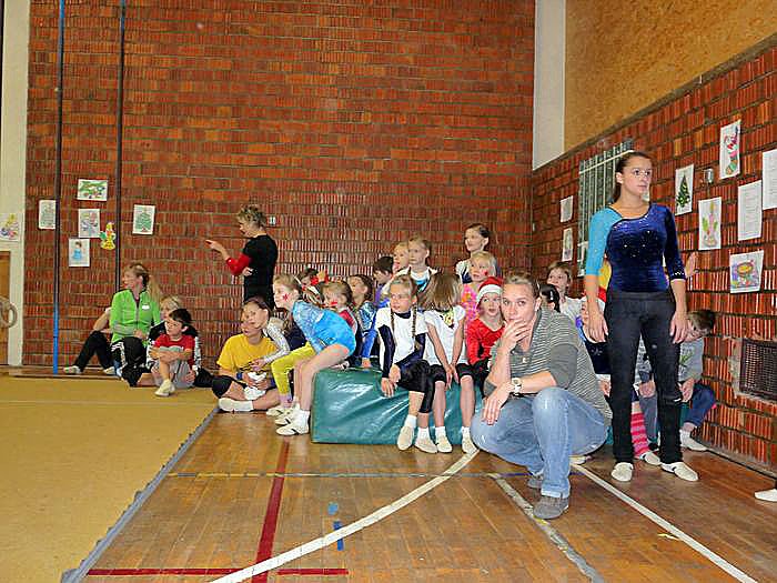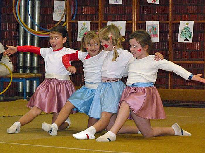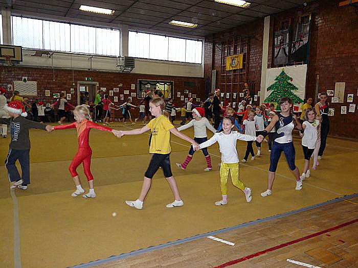 Ganz traditionell begann das Weihnachtsturnen mit dem Einmarsch aller Akteure. Dabei wurden die kleinsten Turnerinnen und Turner von den Älteren an die Hand genommen. Nach dem Warmmachen mit Sabine zeigten die verschiedenen Altersklassen den Besuchern ihr Können. Aber auch Spaß gab es, wenn getanzt wurde.