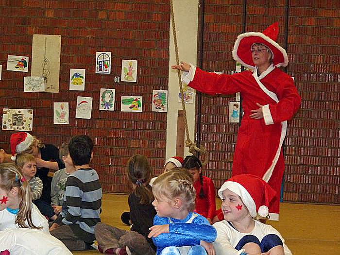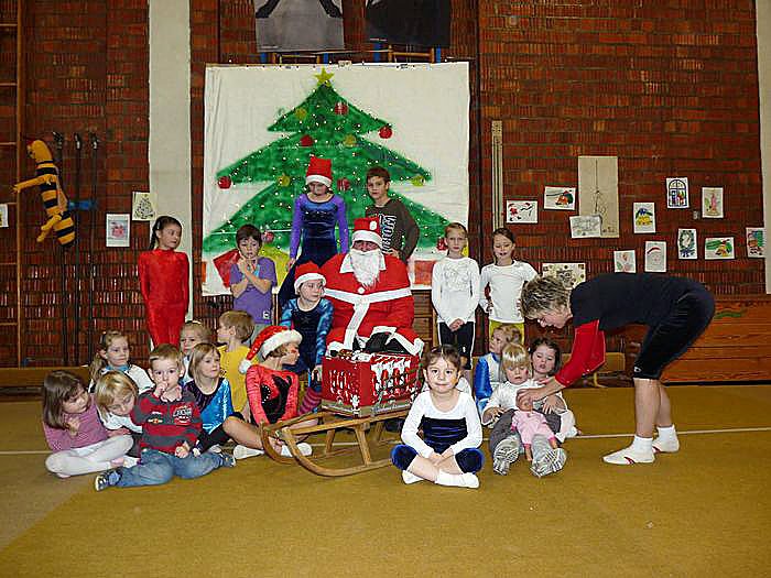 Natürlich blieb das Treiben in der Turnhalle dem Weihnachtsmann nicht verborgen. Er schaute nicht nur vorbei, sondern brachte auch kleine Weihnachtsmänner zum Naschen mit. Wer sich traute, kam auch zum Gruppenfoto mit dem Weihnachtsmann.