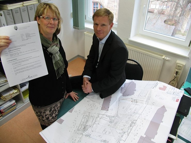 Zum Bild: Bau- und Wirtschaftsdezernentin Inge Klaan und Bauordnungsamtsleiter Mike Szybalski mit der Teil-Baugenehmigung.