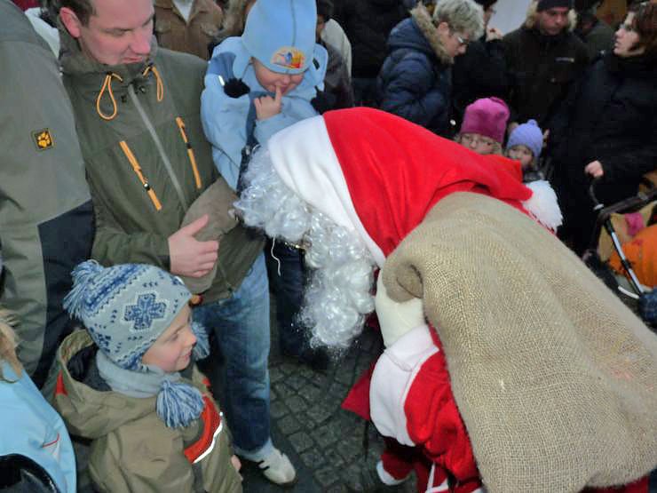 Natürlich war auch der Weihnachtsmann auf dem Weihnachtsmarkt präsent. Er hatte sich sogar einen klein Gehilfen mitgebracht, um die Arbeit ordentlich bewältigen zu können.