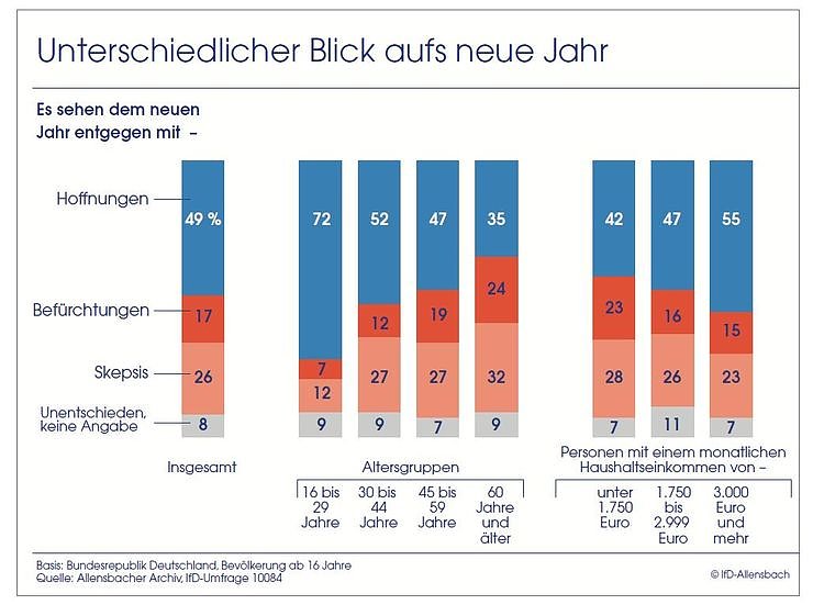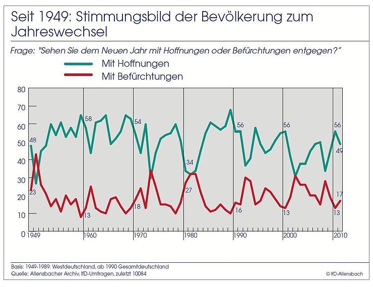 Zwar hat sich die Stimmung im Vergleich zum Vorjahr, als mit 56 Prozent der Bürger ein außergewöhnlich großer Teil der Bevölkerung optimistisch für das neue Jahr gestimmt war, etwas eingetrübt. Aber gerade im Vergleich zu früheren Jahren ist auch der aktuelle Wert als hoch zu bewerten. Eine Erklärung für die gute Stimmung liegt sicherlich darin, dass das alltägliche Leben der Bürger von den globalen Risiken bislang weitgehend abgeschirmt bleibt: Die Arbeitslosigkeit liegt auf dem niedrigsten Stand seit der Wiedervereinigung, die wirtschaftliche Situation der Bevölkerung insgesamt hat sich in den zurückliegenden Jahren stabil bis positiv entwickelt. Die Frage, die das Institut für Demoskopie Allensbach traditionell seit 1949 jeweils zum Jahreswechsel an die Bevölkerung richtet, lautet: "Sehen Sie dem neuen Jahr mit Hoffnungen oder Befürchtungen entgegen?" Die Ergebnisse der Langzeitbetrachtung bilden ein Stimmungsbarometer der Bundesrepublik. In 36 der 63 Jahre zwischen 1949 und heute sagte die absolute Mehrheit der Bürger, dass sie mit Hoffnungen auf das neue Jahr blicke. Besonders in den 1950er, 1960er und auch noch den 1970er Jahren zeigte sich in der Bevölkerung ein ausgeprägt positives Stimmungsbild.