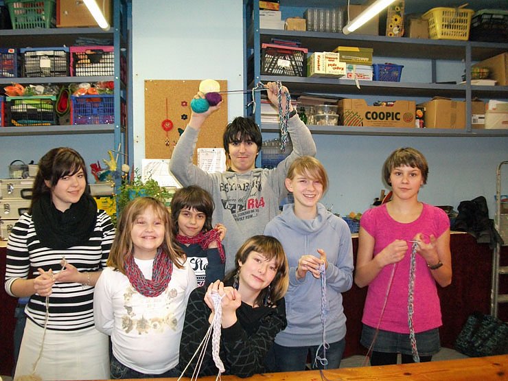 Ganz entspannt wurden nun aus drei Farben 10m lange Schläuche gestrickt, um am Ende als schal benutzt zu werden. Jedes Mädchen kann nun in der Schule ein neues selbstgemachtes modisches Beiwerk vorführen.