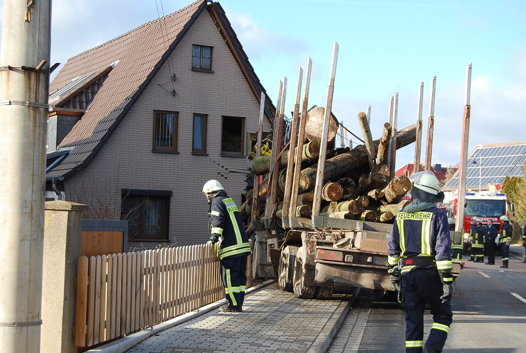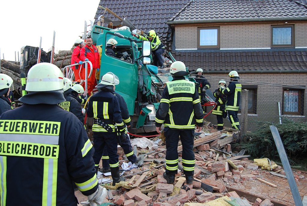 In Wipperdorf ist am Mittag ein Langholz-LKW in ein Wohnhaus gekracht. Kurz vor 12 Uhr war der in Richtung Bleicherode fahrende LKW mitten im Ort aus unbekannter Ursache in einer leichten Rechtskurve auf die Gegenfahrbahn geraten und hatte dort zunächst einen entgegenkommenden PKW gerammt. Wenige Meter später krachte der Holztransporter mit voller Wucht in ein Wohnhaus. Der Fahrer aus Rottleberode (Sachsen-Anhalt) wurde dabei im Fahrerhaus eingeklemmt. Die Rettungskräfte benötigten eine Stunde, um den Mann aus den Trümmern zu bergen. Der 41-jährige selbstständige Fuhrunternehmer musste mit schweren Verletzungen in ein Krankenhaus gebracht werden. Der PKW-Fahrer wurde leicht verletzt.