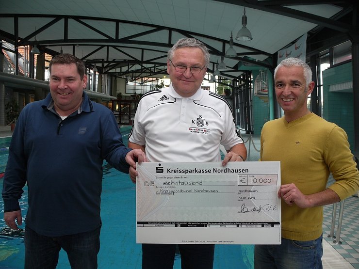 Frank Kirchhoff (links) und Axel Heck (links), die Organisatoren des "Tags der Legenden" haben am Nachmittag einen Scheck über 10.000 Euro an den Präsidenten des Kreissportbundes Nordhausen, Siegfried Janiszewski, übergeben. Mit der Spende aus dem Erlös des Hallenfußball-Turniers soll die Vorbereitung auf das Seepferdchen finanziell unterstützt werden.