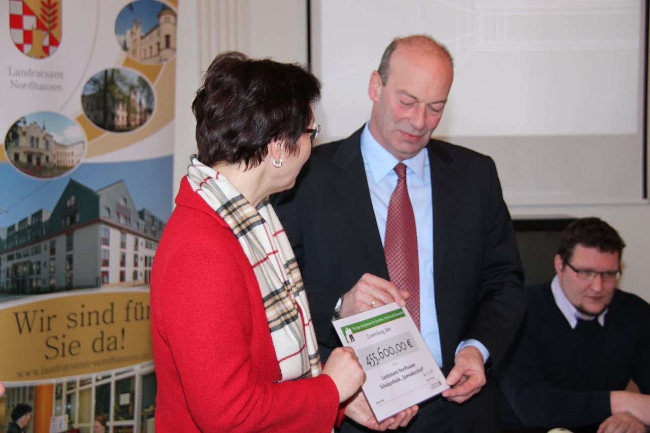 In seinen Dankesworten an die Ministerin erinnerte Landrat Joachim Claus daran, dass oft die Frage gestanden habe: Was wird aus der Turnhalle? Er sowie der Bürgermeister Nordhausens, Matthias Jendricke, und Schulsportkoordinator Werner Hütcher würdigten das gemeinsame Engagement zwischen Stadt, Landkreis, Schulamt und Gymnasium im Vorfeld der Mittelübergabe. Das Ergebnis des gemeinsamen Handelns zeige sich auch in dem Umstand, dass 10 Prozent der gesamten Landesförderung in den Landkreis Nordhausen fließen, so Jendricke.