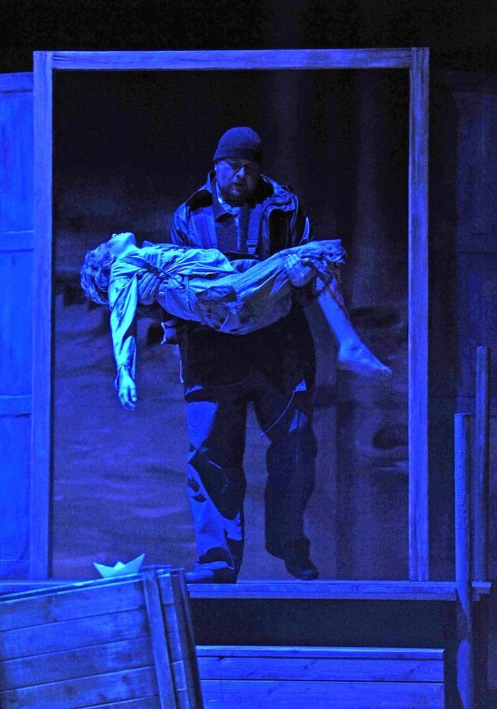Stimmungsgeladene Bilder in Rauschnings Bühnenbild: Grimes und sein toter LehrlingMarkus L. Frank dirigiert das Loh-Orchester, das souverän die wirklich beeindruckende Musik Brittens dem Publikum nahe bringt. Stellenweise fast jazzig, dann wieder zurückgenommen ins Rezitativ, manchmal so dezent untermalend, dass es wirkt wie eine Filmmusik und dann vor allem in den Zwischenspielen so kraftvoll dramatisch, dass man die Wellen in der Brandung zu hören glaubt.Nach dem "Raub der Lukrezia" im vergangenen Jahr haben die Nordhäuser Theatermacher gestern erneut bewiesen, dass es nach wie vor möglich ist, Benjamin Brittens Opernwerke so aufzuführen, dass es auch ein Publikum in der so genannten Provinz zu Beifallsstürmen hinreißt. Und diese Stürme hatten sich am gestrigen Abend ausnahmslos alle Akteure redlich verdient.