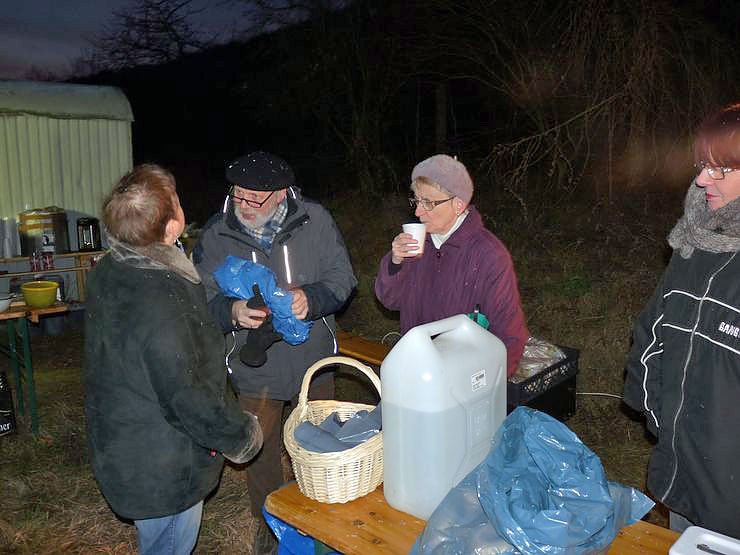 Am Glühweinstand hatten die vielen Helferinnen um Vereinssprecherin Helga Wenzel alle Hände voll zu tun, um die vielen Besucher (bestimmt am Anfang ca. 200) versorgen zu können. Denn der Durst auf Glühwein war kaum zu stillen. Einen guten Anteil daran hatte die Kälte, dass man oft lieber gleich Glühwein mit Schuss verlangte. So war es nicht verwunderlich, dass es am Glühweinstand sogar zur Schlangenbildung kam. Ganz hartgesottene tranken trotz der Kälte Bier. Am Bratwurststand standen u.a. Detlef Koch und Manfred Kucksch.