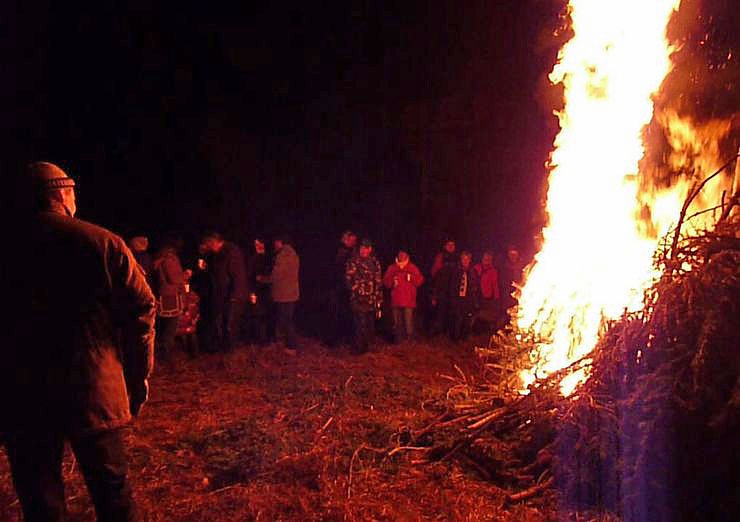 Bei trockenem Wetter und Temperaturen schon knapp unter dem Gefrierpunkt versammelte man sich dicht am Feuer. Allerdings stand der Wind heute etwas ungünstig. Wenn er ab und zu mal auffrischte zog der Rauch mal schnell Richtung Stehtischen. Aber das machte dem Spaß keinen Abbruch. In dem Video können Sie mal schauen, wie schnell so ein Weihnachtsbaum in Flammen aufgehen kann.