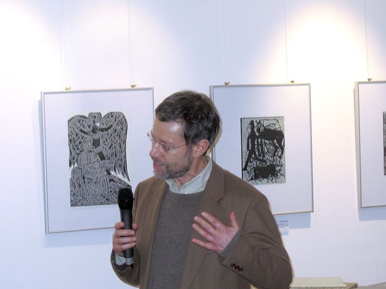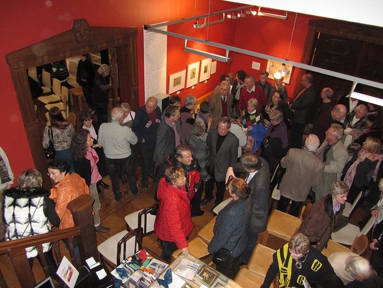 Das Foyer des Kunsthauses und alle angrenzenden Räume waren so gut gefüllt, dass die Sitzgelegenheiten bei weitem nicht für alle ausreichten. Das große Interesse der Nordhäuser an ihrem Dichter und ihre Neugier auf die gezeigten Exponate wurden in der würdigen Laudatio von Heidelore Kneffel noch verstärkt. Angereichert mit Anekdoten und Auszügen aus Hagelstanges reichhaltigem Werk offenbarte die rührige Kuratorin einen liebevollen Blick auf den Nordhäuser Künstler, über den Kritiker einst sagten, dass "sein Werk aus der zweiten Hälfte des 20. Jahrhunderts nicht mehr wegzudenken" wäre. Schließlich spielte Frau Kneffel bewegende Originalaufnahmen aus dem "Venezianischen Credo" ab, einstmals aufgenommen und vorgetragen vom Geehrten sebst.