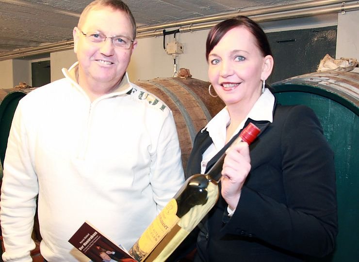 Daniela Külbel von der Echter Nordhäuser Traditionsbrennerei beim Überreichen des Preises an den Gewinner Ingo Stallknecht