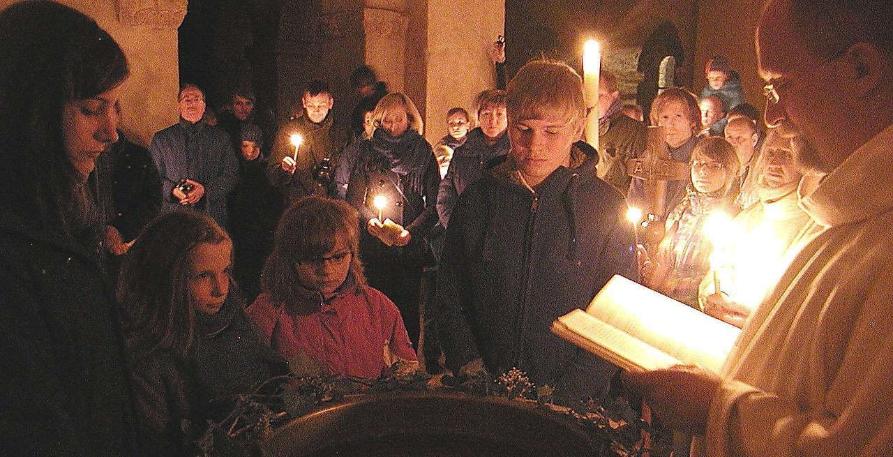 Nun, da in einem Alter getauft wird, in dem die Täuflinge selbst ein bewusstes Ja zum Empfang des Sakramentes sagen, ist solche Frage Hinweis darauf, dass nicht nur die geistlichen, sondern auch die weltlichen Dinge mit Umsicht bedacht sind: Das Taufwasser aus dem alten, schönen Taufbecken der Basilika in Münchenlohra soll über den Kopf rinnen, nicht über die Brille! Gleich vier (gemeinsame) Taufen feierte die zum Osternachtgottesdienst versammelte Gemeinde im Licht der Osterkerzen zu fast mitternächtlicher Stunde in der Basilika, nachdem man in der Krypta die Auferstehung Christi besungen hatte.
