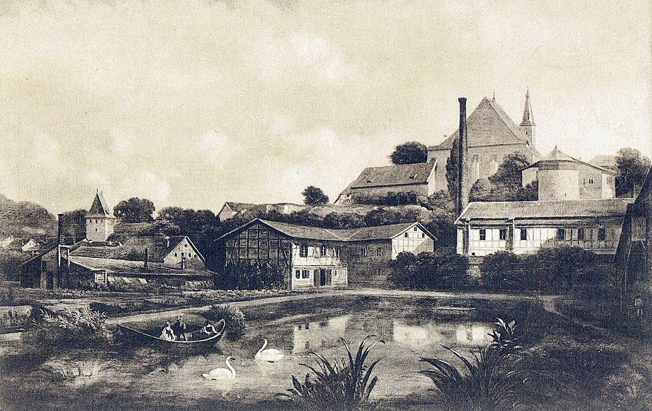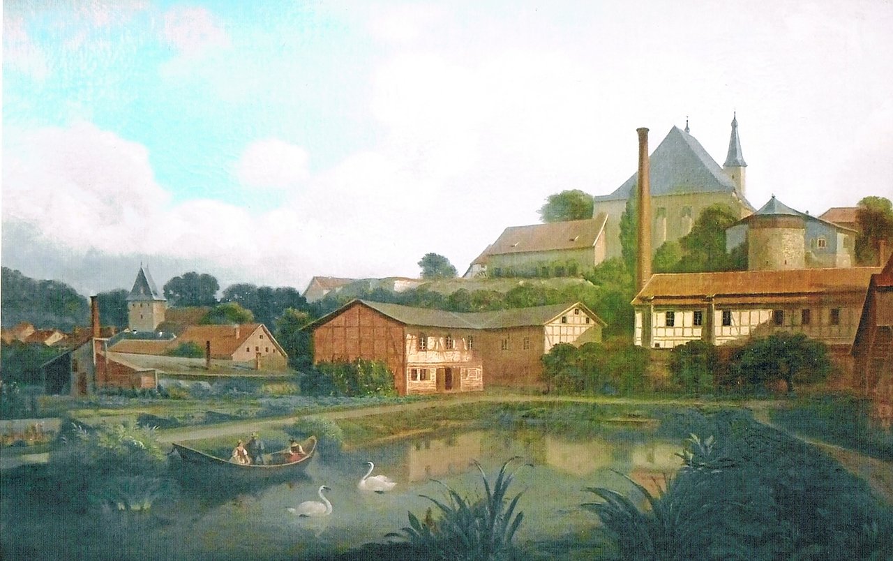 Welche historische Situation in der Stadt Nordhausen zeigt uns der Künstler auf seinem Werk? Wie es im oben aufgeführten Gemäldetitel heißt, ist im Bildvordergrund der Teich der Gärtnerei Kaiser zu sehen. 1835 gründete ein Johann Heinrich August Schrader, geb. 1798, in der Elisabethstraße 838 (Nr. 12 und 13) eine Gärtnerei. Sie lag zwischen dem Elisabeth-Hospital und der Kaisermühle. or dem Wohn- und Geschäftshaus floss der Mühlgraben. Schraders Tochter heiratete einen Karl Kaiser, der nun mit in dem Haus wohnte und die Gärtnerei 1863 von seinem Schwiegervater übertragen bekam. Im Jahr 1865, als Eichler sein Bild malte, wird Schrader im Adressbuch als Particulier benannt, was bedeutet, dass er ohne Anstellung und Gewerbe von seinem Vermögen lebt.