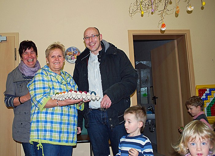 Insgesamt 540 bunte Ostereier sorgten so im Kindergarten "Sonnenkäfer", dem Kinderhaus Grüningen, dem Pflegeheim "Schloss Sophie von Kühn", dem Seniorenzentrum "Am Waidhof" und beim Seniorennachmittag für eine kleine Osterüberraschung.