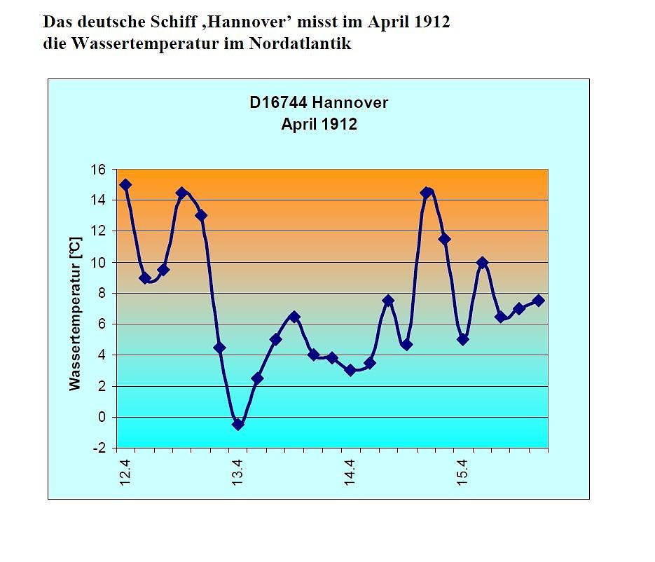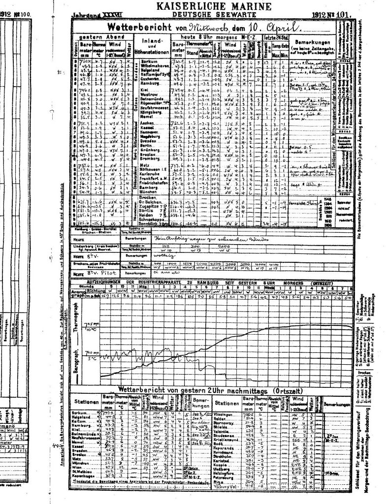 Das meteorologische Journal der Titanic liegt leider nicht mehr vor. Im Archiv des Deutschen Wetterdienstes in Hamburg, in dem die über 37 000 Journale aus der Zeit der Deutschen Seewarte archiviert sind, finden sich aber Hinweise auf die Eissituation des April 1912. Insgesamt 34 Schiffe berichten über Eisfelder und Eisberge. Der Titanic konnten die Schiffe aber nicht mehr helfen - sie waren zu weit weg, zu früh oder zu spät an der Unglücksstelle. In den Journalen sind lediglich Beobachtungen von Wrackteilen und Schwimmwesten dokumentiert - stumme Zeugen der Katastrophe, die sichin dem Eis des Nordatlantiks vor 100 Jahren ereignete.