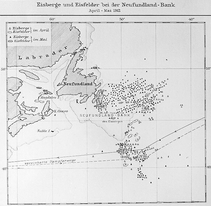 Kapitäne verfügten schon 1912 über Eisbergkarten von Seegebieten Die meteorologische Situation vor 100 Jahren war nicht ungewöhnlich. Eisfelder und Eisberge drifteten mit dem Labrador-Strom an Neufundland vorbei nach Süden. Obwohl die empfohlenen Dampferwege diese Situation berücksichtigten, war die Fahrt in diesem Gebiet immer mit Risiken verbunden.