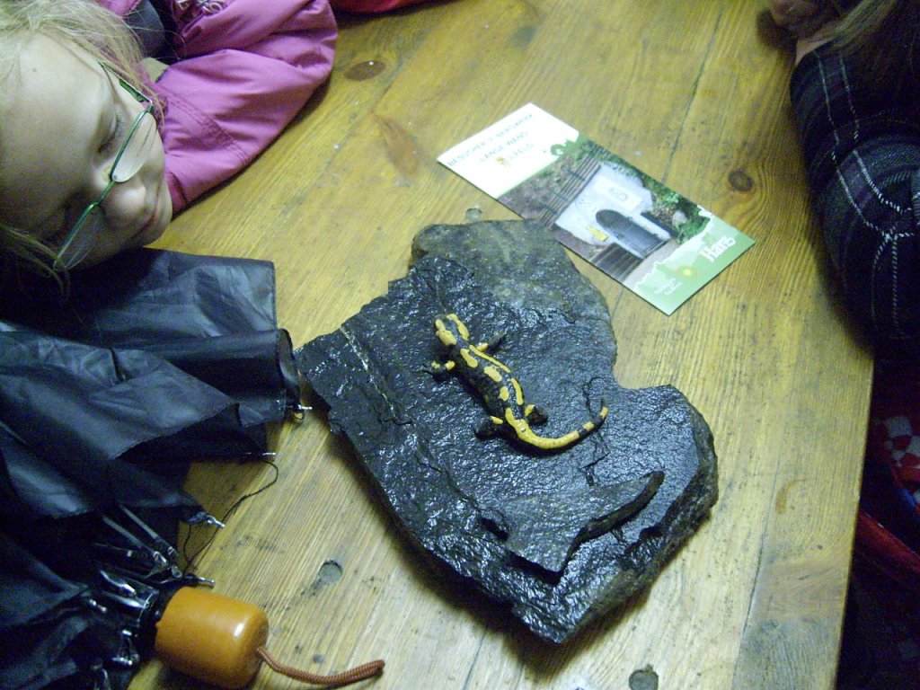 Die Ferienkinder aus Niedersalza hatten sich mit ihren vier Erziehern aufgemacht, um diesem Bergwerk einen Besuch abzustatten. Sie kamen - wie könnte es auch anders sein - mit der Bahn nach Ilfeld angereist. Dann ging es zu Fuß zur Langen Wand. Hier im Bergwerk wurde nach einem herzlichen Empfang durch die Wanderführergruppe erst einmal gefrühstückt. Nach der Stärkung ging es ohne Gepäck hinauf auf die Lange Wand um den Harzer Sagenpfad zu erkunden. Dann gab es noch eine Überraschung, denn seit wenigen Tagen, steht hier oben auf dem Berg ein Wanderstempelkasten der Harzer Wandernadel. Jedes Kind bekam einen kleinen Zettel und konnte sich so einen Stempelabdruck darauf drücken und als Andenken mit nach Hause nehmen. Dann ging es den Harzer Sagenpfad weiter am Riesen vorbei bis ins Tal und an der Behre entlang wieder zum Besucherbergwerk. Jetzt gab es erst einmal etwas zu Esen. Es gab Wienerwürstchen mit Tost und Ketschup und leckeren Tee zu trinken. Als Nachtisch bekamen die Kinder ein Märchen erzählt über den Kobold und das Kobalt in der Langen Wand.