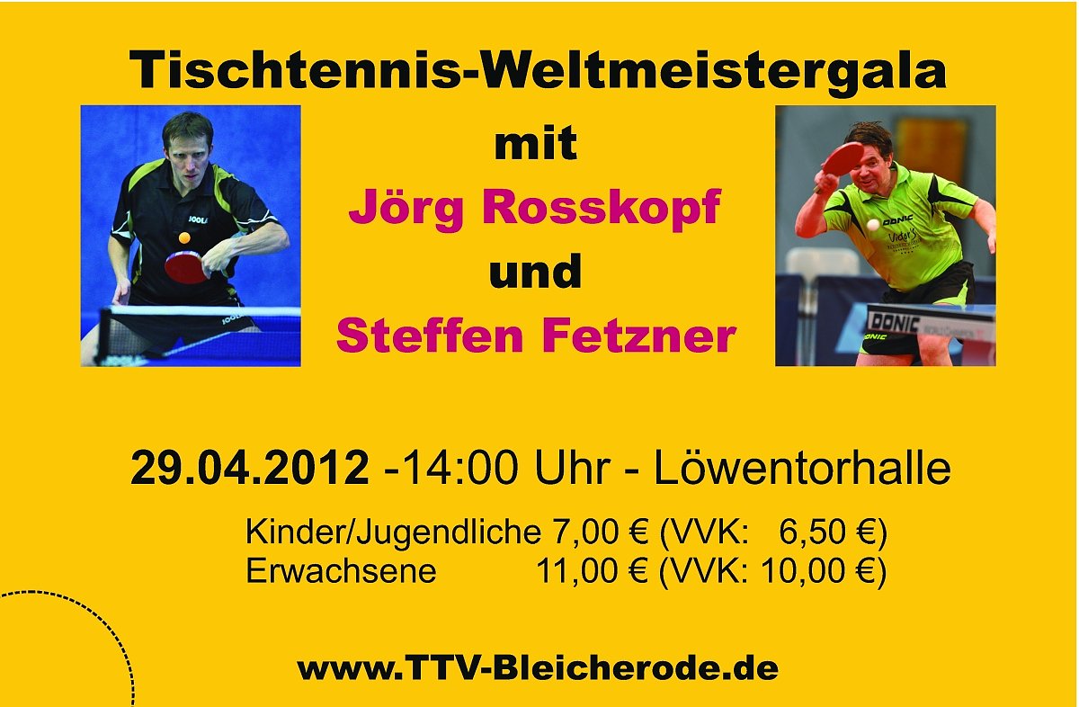 Zudem werden drei Eintrittskarten verlost. Wer weiß, wann die beiden Bleicheröder Stargäste gemeinsam Doppel-Weltmeister wurden, hat mit der richtigen Antwort an gewinnspiel@tischtennis-bleicherode.de die Chance zu gewinnen (Namen und Anschrift nicht vergessen). Der Einsendeschluss ist der 25.04.2012, die Gewinner werden per E-Mail benachrichtigt.