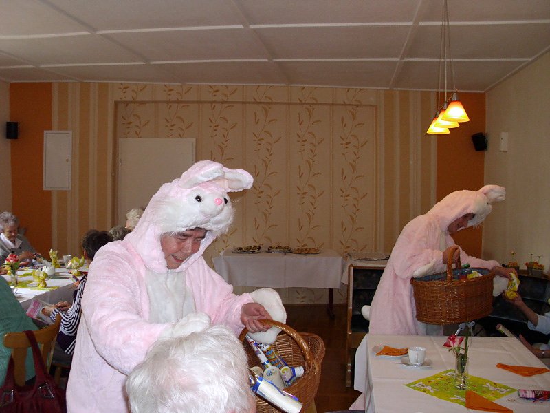 Auf dem Weg hinunter vom Juventas zur Gaststätte konnte man beobachten, wie alle Senioren auf die Wiese der Freifläche blickten. Hatte der Osterhase hier schon seine Körbchen versteckt, so wie in den letzen Jahren? Waren schon Eier oder Naschereien zu erblicken? Aber nichts zu sehen, keine Eier, keine Körbchen, auch nicht hinter dem Gebüsch! Kurze Fassungslosigkeit, Ratlosigkeit, vielleicht auch Enttäuschung - der Osterhase ist nicht da gewesen! Was nun?! Was war geschehen? Hatte er sich nach der frostigen Nacht doch lieber wieder in sein Erdloch verkrochen oder verpennt? Keine Antwort auf diese Frage.