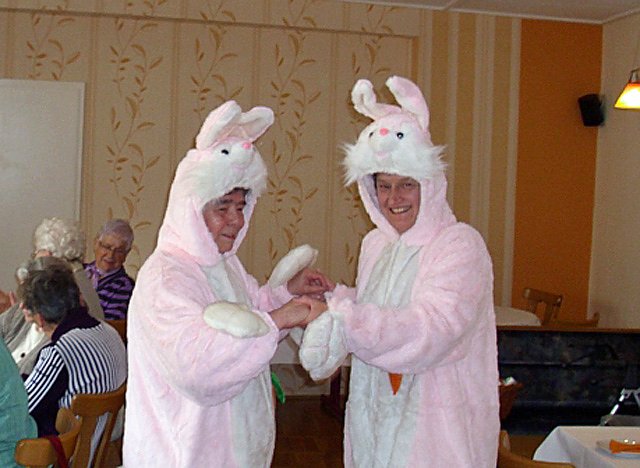 Nun sind alle ganz gespannt, Totenstille im Raum und alle warten darauf, was jetzt wohl passiert. Die Tür geht auf und es kommen sogar zwei rosa-weiß gekleidete Plüschhasen (Christa Groß und Ines Leipold) herein. Tosender Beifall sowie freudiges und herzhaftes Lachen. Man merkte richtig, wie von allen die Anspannung wie ein schwerer Stein abfiel. Zu passenden Osterliedern von der CD verteilten die beiden an alle ein kleines Säckchen mit Osterei und Naschereien und ein kleines zusätzliches Präsent. Zum Ausklang dieses besonderen Nachmittages läuteten wir, zwar bei kühleren Temperaturen und doch zumindest Sonnenschein, den Frühling ein mit vielen Volks- und Frühlingsliedern ein, so zum Beispiel "Nun will der Lenz uns grüßen". Na, da kann ja nun wirklich nichts mehr schief gehen, oder?!