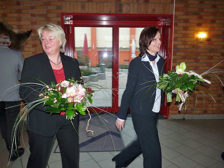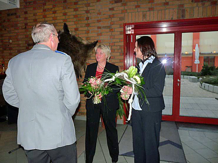 Für die Politikerinnen hielt Oberstleutnant Steinseifer je einen Blumenstrauß parat. Einen besonders netten Einfall hatte Oberstleutnant Thorsten Gleim. Er erinnerte an die Soldatinnen und Soldaten, die hier in Bad Frankenhausen auch einen anstrengenden Dienst hatten und bei den Ehrungen nicht so erwähnt werden, eingeschlossen die Familienbetreuungsstelle der Bundeswehr in Bad Frankenhausen. Sein Dank ging aber auch an die Partner und Verwandten der eingesetzten Soldaten, die mit viel Verständnis hier in der Heimat verblieben waren. Stellvertretend erhielt die Frau des Kommandeurs einen Blumenstrauß.
