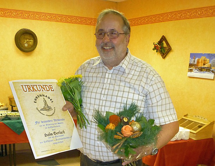 Holm wurde mit der Ehrennadel des Kyffhäuser-Kreissportbundes ausgezeichnet. In einer kurzen Ansprache ließ das Mitglied des Präsidiums des Kyffhäuser-Kreissportbund e.V. Steffen Hommel wichtige Stationen im Taucherleben von Holm Gerlach Revue passieren und überreichte ihm anschließend die Ehrennadel. Bis zur letzten Sekunde konnte die Verleihung geheim gehalten werden, so dass er überrascht aber hoch erfreut die tolle Auszeichnung entgegennehmen konnte.