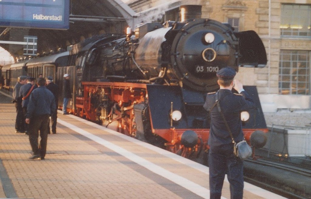 Dazu lesen Sie bitte mehr im dritten Teil meiner kleinen Reihe. Auf Grund des Urheberrechts darf ich keine Bilder aus dem mir vorliegenden Material veröffentlichen. Stattdessen sehen Sie hier drei Bilder mit der schnellsten noch in Betrieb befindlichen, kohlebetriebenen Schnellzugdampflok (140 km/h), der 03 10 10, die in Halle stationiert und auf dem Bild mit etwa baugleichen Wagen zu sehen ist, wie sie in das Unglück 1939 involviert waren. Die Aufnahmen machte ich bei einer Sonderfahrt rund um den Harz im Frühjahr 2005. Am Genthiner Unglück waren jedoch zwei noch schwerere D-Zug-Lokomotiven vom Typ 01 beteiligt.