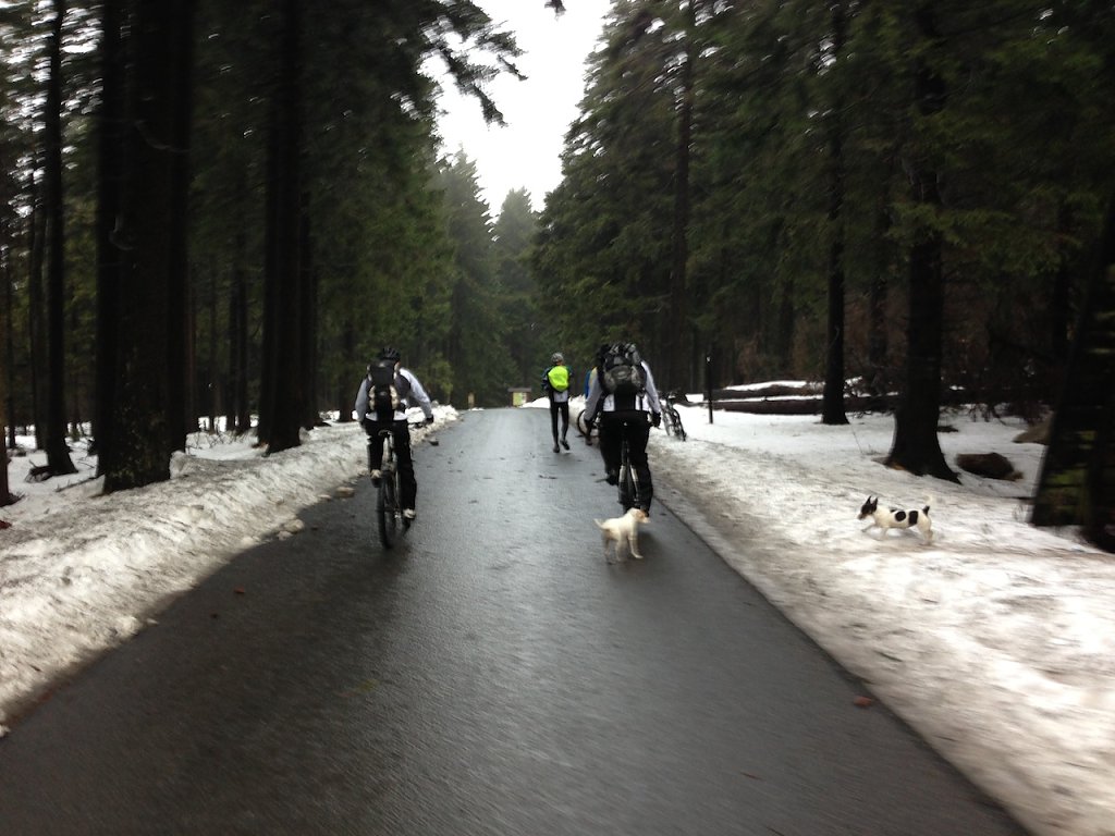 Pünktlich um 9 Uhr starteten ca. 30 Fahrradbegeisterte (und zwei kleine Hunde) zur traditionellen Brockenbefahrung am Heiligen Abend. Nach rund einer Stunde standen alle vor dem Brocken-Restaurant.