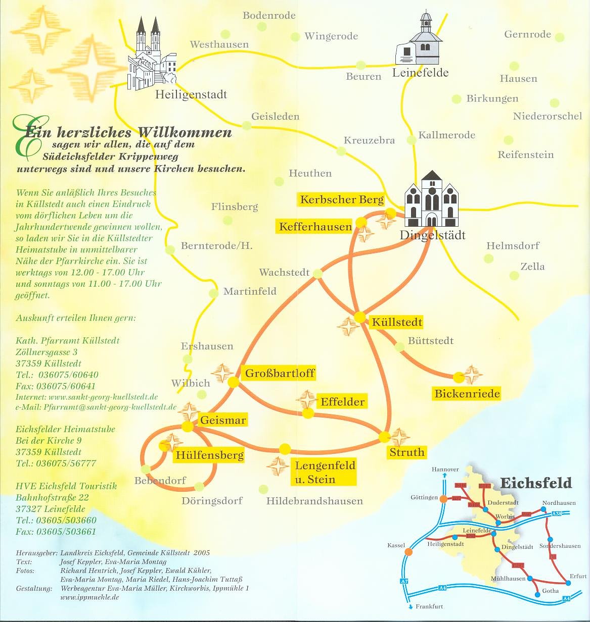 Seit 1990 laden zehn Kirchengemeinden im Eichsfeld in der Zeit zwischen Weihnachten und Ende Januar Einheimische und Gäste ein, den Südeichsfelder Krippenweg zu besuchen. Stationen sind: Klosterkirche Kerbscher Berg Dingelstädt, Pfarrkirche St. Johannes der Täufer Kefferhausen, St. Alban Effelder, Pfarrkirche St. Peter und Paul Großbartloff, St. Ursula Geismar, Wallfahrtskirche Christus der Erlöser Hülfensberg, Pfarrkirche St. Mariä Geburt Lengenfeld/Stein, St. Jakobus d. Ä. Struth und St. Sebastian in Bickenriede.In vielen Varianten und Formen, mit diversen Materialien und Farben, doch stets mit gleichem biblischen Kern wird das Geschehen der Heiligen Nacht von Bethlehem so dargestellt, wie es der hl. Franziskus von Assisi im Jahr 1223 anregte: Im offenen Stall schläft das Jesuskind in der stroh- oder heugepolsterten Krippe und wird besorgt von Maria und Josef bewacht; Ochs` und Esel und die staunenden Hirten vervollständigen die Weihnachtsszene mit ihren friedlich grasenden Schafen und Ziegen unter dem Glanz des Morgensterns.