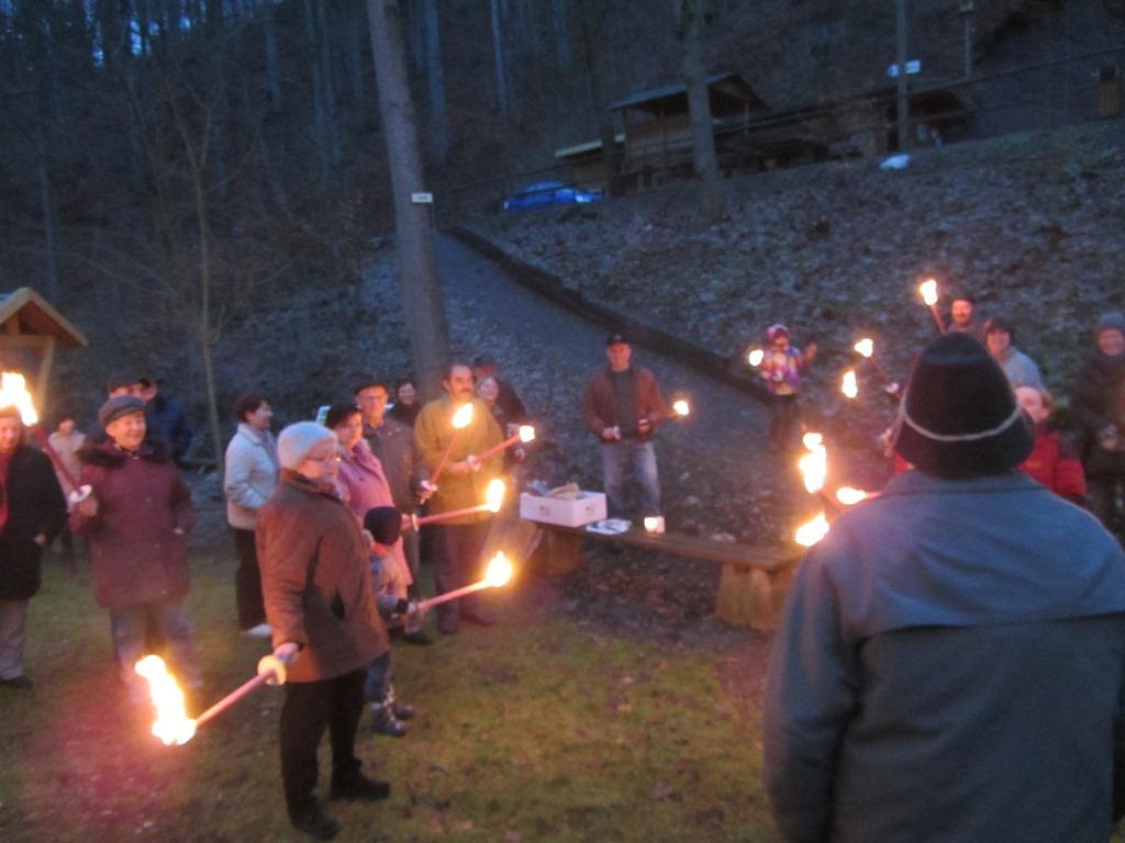Schon bei der Ankunft der Gäste brannte das winterliche Feuer um Wärme zu verbreiten. Nach einigen noch notwendigen Vorbereitungen war es dann so weit und die Fackeln wurden angezündet. Dann ging es im Schein der Fackeln den schmalen Pfad hinauf auf den Bergrücken. Langsam wand sich der Lindwurm mit den Fackeln den Berg hinauf.