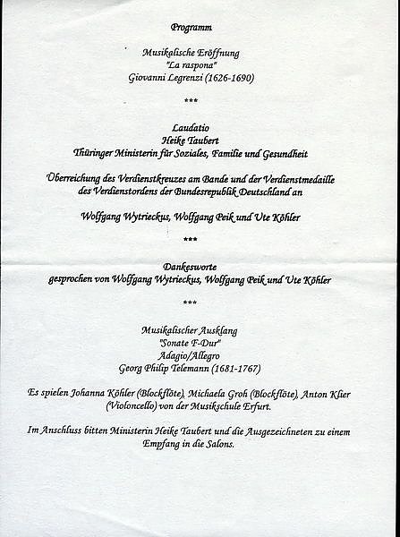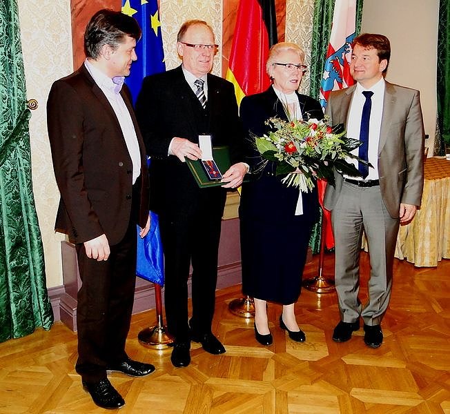 Sozialministerin Heike Taubert sagte vorab: Wolfgang Wytrieckus, Ute Köhler und Wolfgang Peik (im Bild v.li.n.re.) haben sich weit über das normale Maß hinausgehend bürgerschaftlich engagiert. Ihr beispielhafter Einsatz für das Gemeinwesen im Freistaat soll mit dem Verdienstorden der Bundesrepublik Deutschland öffentlich gewürdigt und anerkannt werden. Sie haben unsere Gesellschaft bereichert und deren Zusammenhalt gestärkt. Wie sie engagieren sich viele Bürgerinnen und Bürger unermüdlich und unentgeltlich. Das macht unser Land liebens- und lebenswert.