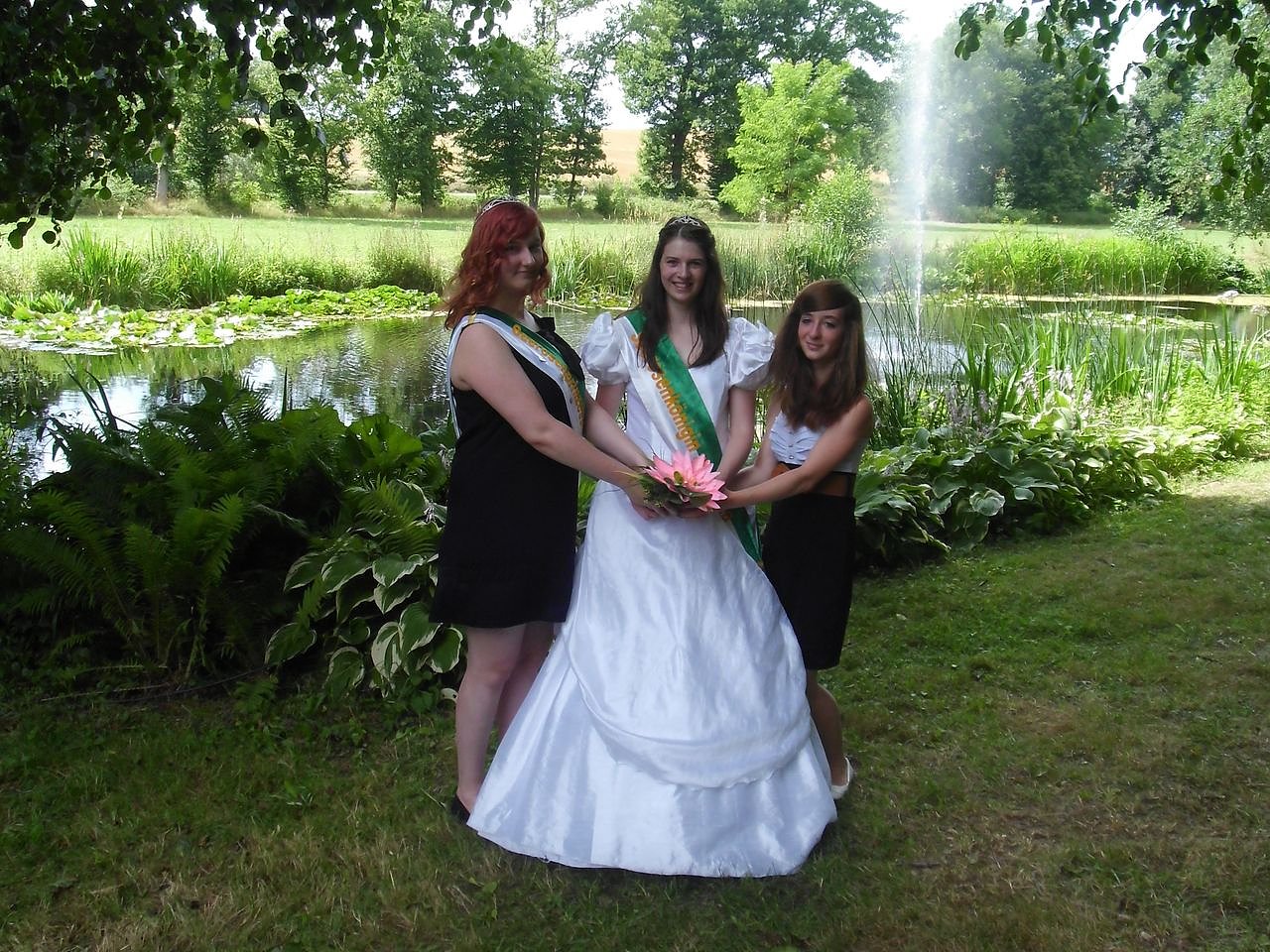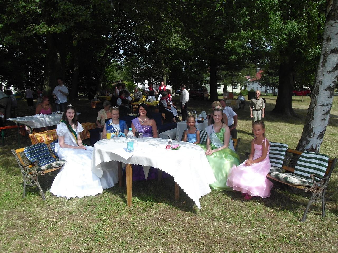 Jeder Helfer verschwindet kurz und kommt frisch und schick gekleidet zum Parkfest. Es ist alles bereit. Die Kuchenfrauen sind superpünktlich um 14.00 Uhr wird die Tafel eröffnet. Die VIP-Gäste aus Fuldatal – Rotwesten reisen an. Die deutsche Seerosenkönigin mit ihren zwei Prinzessinnen. Die Rhododendronkönigin aus Sülzhayn, die Karstkönigin aus Branderode, die ehemalige Seerosenprinzessin Julia aus Werna und viele Gäste. Eröffnung des Festes um 15.00 Uhr durch den Ortsteilbürgermeister Wolfgang Krug und die Hoheiten, Seerosenkönigin Angelina und Seerosenprinzessin Stefanie(Beide sind Wanderkönige der Harzer Wandernadelinitiative). Fototermin und schon konnte das Programm beginnen. Der Folklorechor aus Sülzhayn sang unter den Bäumen. Dank Mikrofon für alle verständlich und zur Freude. Die Carnevalsjugend und Line dance – Gruppen aus Sülzhayn erfreuetn das Auge. Kuchenfrauen, Feuerwehr und die Mannschaft am Getränkewagen sorgen für das leibliche Wohl.