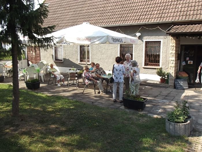 Mit diesen vielen besonderen Eindrücken setzten wir unsere Fahrt dann fort und fuhren über Steinthaleben in Richtung Kelbraer Stausee. In der Hüflerbaude bei der Bungalowsiedlung am Hang gegenüber des Stausees hatten wir unsere Kaffeetafel vorbestellt. Zum Kaffee gab es unter anderem leckeren selbst gebackenen Kuchen Hüflerschnitte und natürlich auch gerade bei dieser Wärme verschiedene Erfrischungsgetränke, Eisbecher und mehr. Anschließend saßen wir noch vor der Baude bei einem leichten Lüftchen und möglichst etwas schattig bis es mit dem Bus wieder heimwärts gehen musste und sich so ein sehr eindrucksvoller Nachmittag dem Ende neigte. Gut, dass wir Sondershausen und den Busbahnhof gegen 17.30 Uhr erreicht hatten und so blieb uns bei dem Ausflug auch das ab 19 Uhr einsetzende Unwetter mit Sturmböen, gießkannenartigen Regenschauern zum Glück erspart.