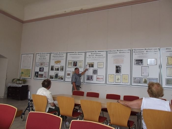 Organisiert hatten diesen Nachmittag wieder Christa Groß und Thomas Leipold und es versprach sehr interessant zu werden. Im Freigelände der Orangerie begrüßte uns den Ortsteilbürgermeister von Bendeleben, Herr Martin Brückner zu der einstündigen Führung. Beginnend mit der langen Geschichte des Ortes Bendeleben , der Schlossanlage mit Schlosspark und der Orangerie. Anschließend ging es dann in die Orangerie zur weiteren anschaulichen Fortsetzung, auch mit Schautafeln. Auch Bendeleben durchlebte seit seiner ersten urkundlichen Erwähnung im Jahre 870 eine wechselvolle Geschichte. Große Namen prägten besonders die Geschichte des Ortes, das sind zum Beispiel Magister Johannes Clajus ,die Freiherren von Uckermann, beginnend mit Johann Jacob von Uckermann (der Zweite), der Gut und Burg erwarb, der Pfarrer und Geograf Cannabich, Familie Kraus (später geadelt als von Krause) und deren Tochter Alexandra von Arnim.