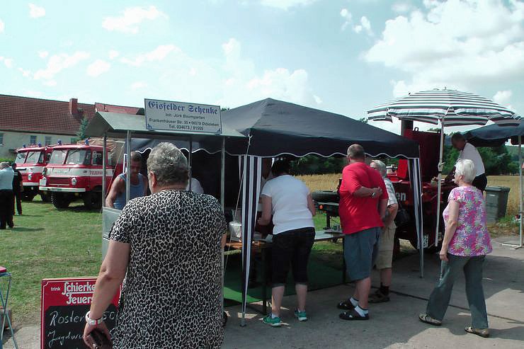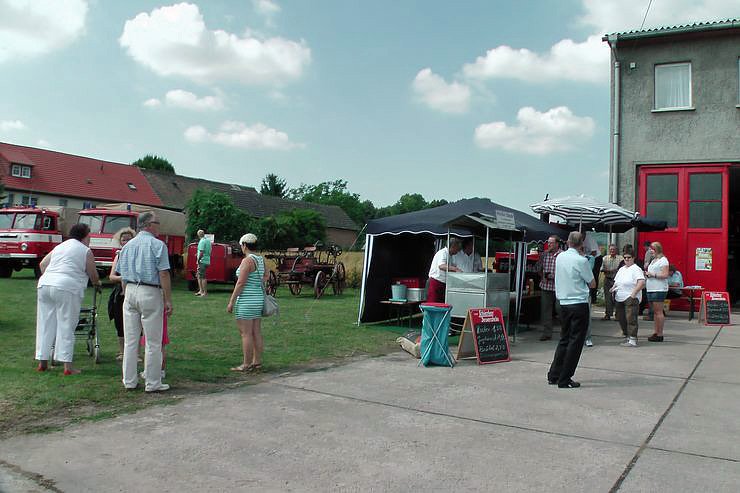 Los ging es mit einem Frühschoppen und deftigem vom Grill. Sehr beliebt und sehr schmackhaft, die Erbsensuppe aus der Feldküche. Selbst mit "auswärtigem" Kennzeichen (SÖM)war man vorgefahren, um einen Topf voll mitzunehmen. Die meisten Besucher, wie auch kn, nahmen sich die Zeit, die leckere Suppe zu essen. Bei starkem Sonnenschein zog es die meisten Gäste in den Schatten des Feuerwehrgerätehauses.