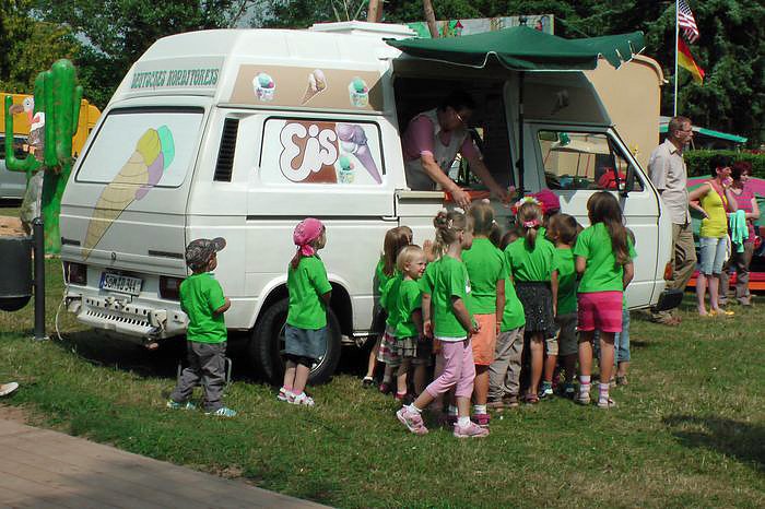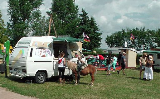 Nein, nicht das Pony hat das Eis gegessen. Aber die Führerinnen mussten sich schließlich auch mal erfrischen. Heiß geht es mit Sicherheit auch heute am Abend bei Tanz mit der Erfurter Gruppe Westend zu, der gerade beginnt, so kn seinen Bericht schreibt. Verbunden ist der Tanz mit einer Feuershow.