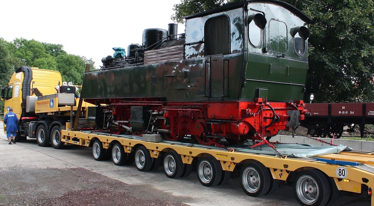 Eine der ältesten Dampflokomotiven der Harzer Schmalspurbahnen GmbH (HSB), die Lok 99 5902 (Baujahr 1898) ist auf einen Straßentieflader verladen worden...