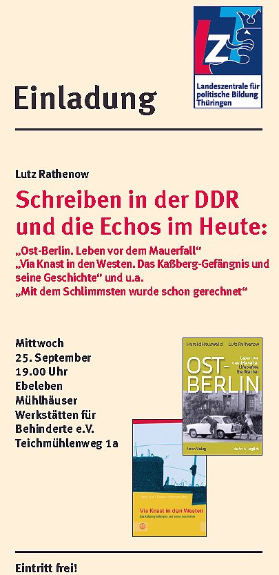 Unter dem Titel Schreiben in der DDR und die Echos im Heute liest Lutz Rathenow aus verschiedenen Werken, so u.a. aus der Neuauflage des Kultbuches Ost-Berlin. Leben vor dem Mauerfall. Hier schon mal eine Info zur beliebten Werkstattlesung in Ebeleben.