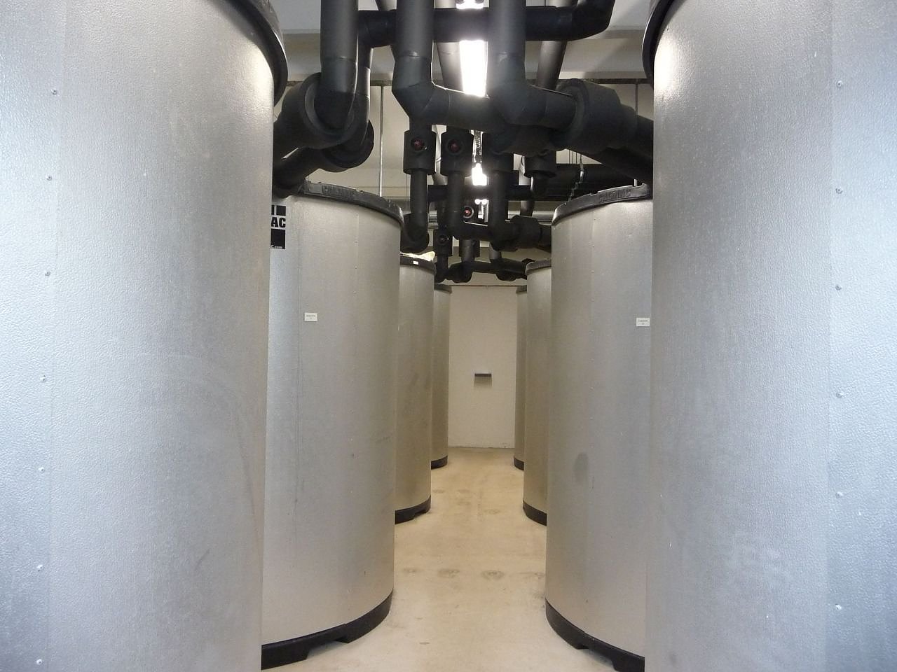 Und sollten die beiden Aggregate einmal nicht ausreichen, um Spitzenzeiten abzusichern, dann liefert ein aus acht Einzelbehältern bestehender Eisspeicher (Bild) zusätzliche 450 kW. In Summe steht dem Klinikum dann eine Kälteleistung von 1.750 kW zur Verfügung. Im Vergleich dazu wird eine Grundlast in den kühleren Jahreszeiten von maximal 300 kW gefahren. Die ist für die permanente Kühlung der Magnetresonanztomographen (MRT), der Computertomographen (CT) und der Linearbeschleuniger sowie der EDV-Technik notwendig.
