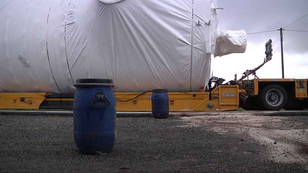 Im Gespräch mit einem Mitarbeiter des Transportunternehmens sagte dieser, dass vermutlich ein oder mehrere Kräne zum Umladen des Behälters, der nach Aken in Sachsen-Anhalt transportiert werden sollte, nötig seien. Wie lange dieser Abschnitt der L 3080 gesperrt bleibt, kann momentan noch nicht berichtet werden.