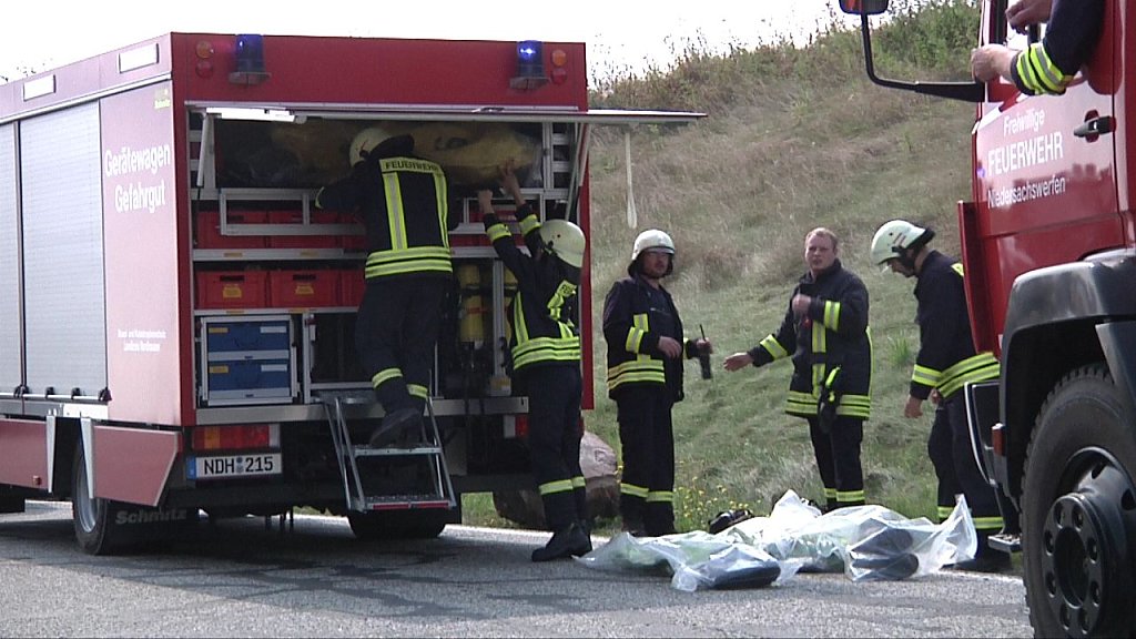 Sofort wurden freiwillige Feuerwehren des Landkreises, die Berufsfeuerwehr, der Katastrophenschutz des Landkreises und die Rettungsdienste alarmiert. Angefordert werden muss eine Spezialpumpe, um die Substanz in einen anderen Behälter umpumpen zu können. Der Verkehr auf der Autobahn ist von diesem Großeinsatz nicht betroffen.