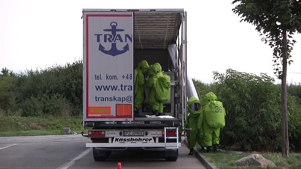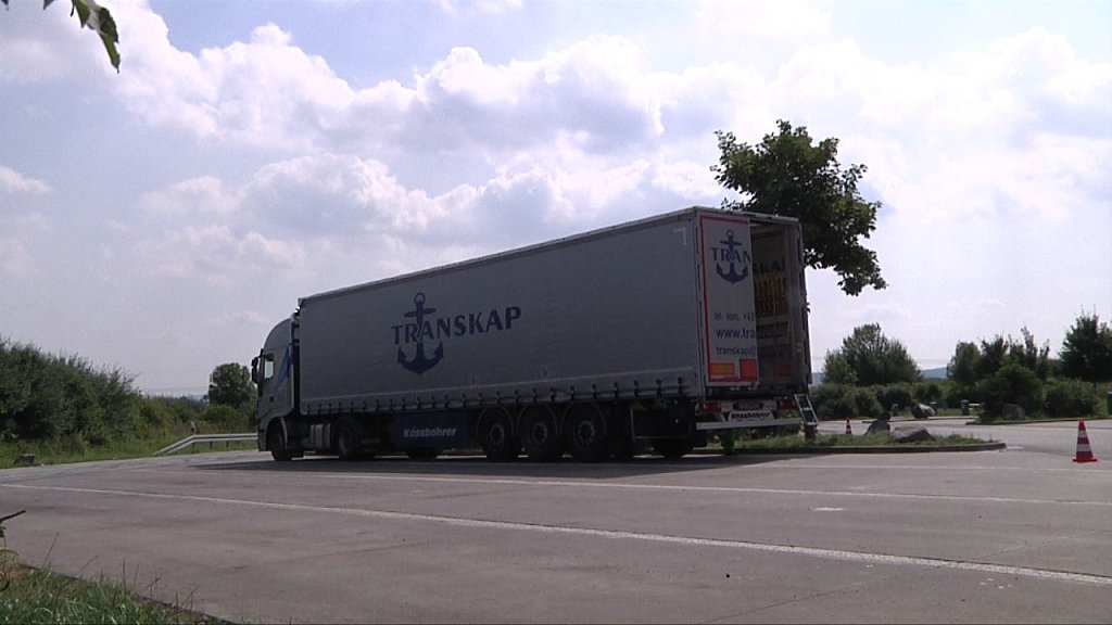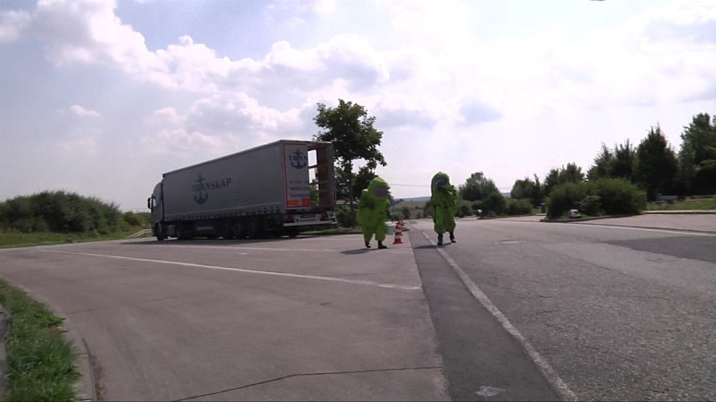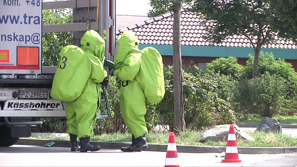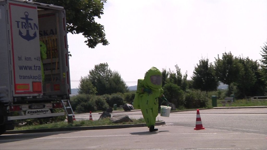 Kurz nach 11 Uhr wurde ein Gefahrgut-Lkw von den Mitarbeitern des Bundesamtes für Güterverkehr kontrolliert und zum Parkplatz geleitet. Dort entdeckten die Fachleute sofort die Gefahr. Aus einem von drei Spezialbehältern war eine hochgiftige Flüssigkeit ausgetreten. Aus den Frachtpapieren ging nicht konkret hervor, um welche Substanz es sich handelt.
