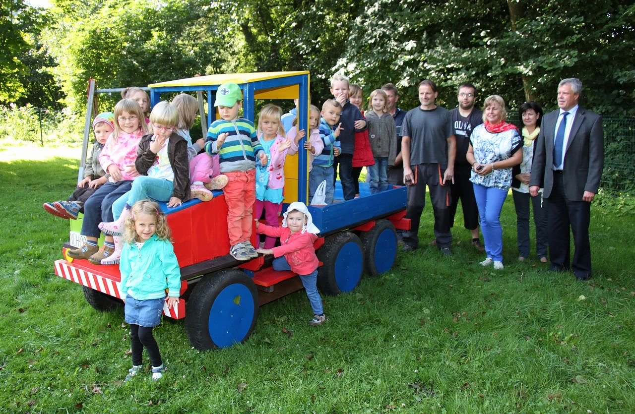 Aufgeregt hüpfen die Mädchen und Jungen auf der Ladefläche des Lastwagens herum. Das Steuer haben sie längst in Beschlag genommen und selbst aufs Dach sind schon ein paar Mutige geklettert. Kein Problem, denn der Lastwagen ist aus Holz, bunt angemalt und steht seit dieser Woche auf dem Spielplatz der Kita Märchenhaus in Krimderode...