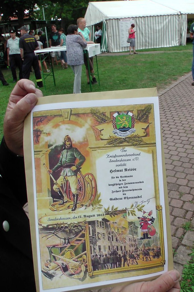 Der Geschäftsführer des Kreisfeuerwehrverbandes Sondershausen, Günter Herting, nahm im Anschluss zwei weitere Ehrungen vor. Er übergab die Goldene Ehrennadel an Helmut Reisse (Mardorf) und Reinhard Winkler (Harzungen). Beide setzen sich seit 22 Jahren dafür ein, dass die Partnerschaft mit dem Feuerwehrverein Jeacha und der FFW Paul Volkmann Jecha funktioniert.