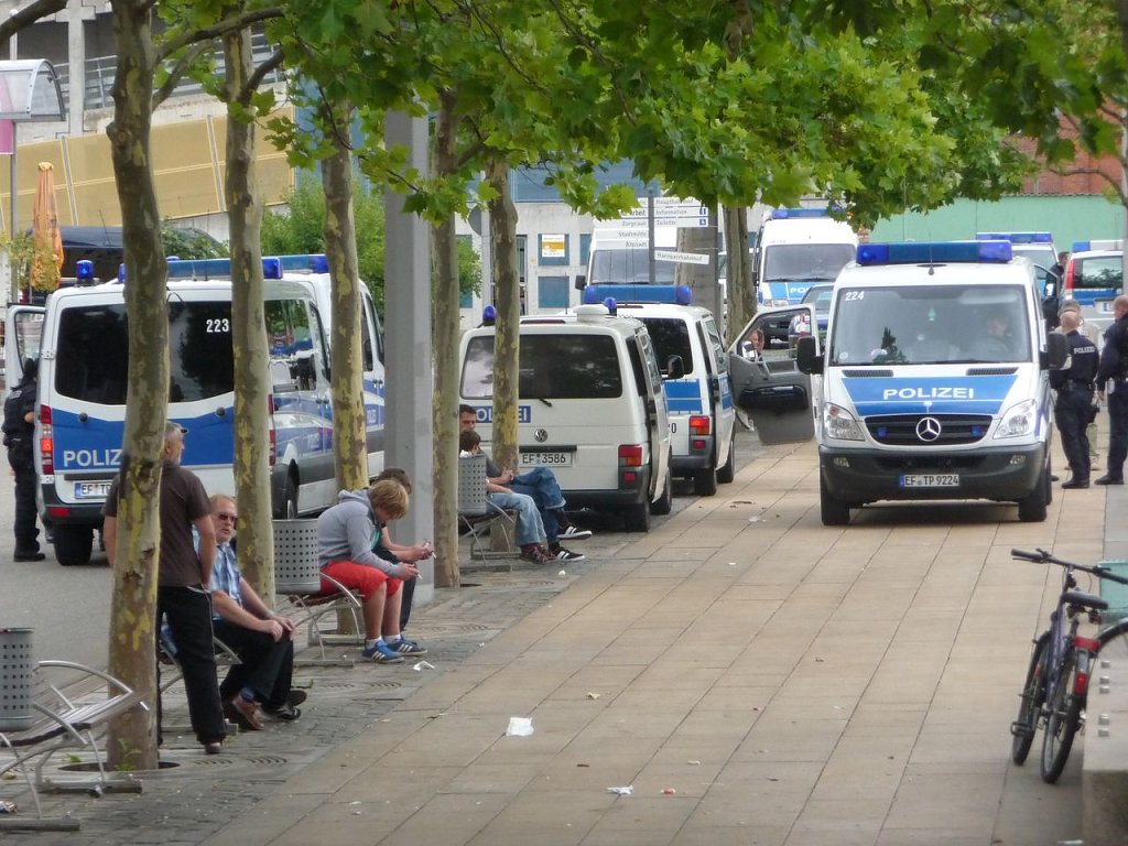 Am Van-der-Foehr-Damm hatten Unbekannte in der Nacht mehrere "Willkommensgrüße" auf den Asphalt gemalt. In der Stadt ist die Polizei unterwegs und am Bahnhof bereitet man sich auf die Ankunft der Jenaer Fans vor.