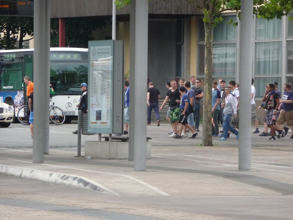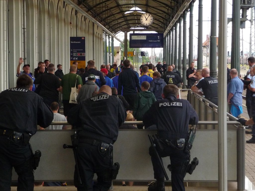 Nach nnz-Informationen waren rund 130 Jenaer Fans mit dem Zug angereist, weniger als erwartet. Sie wurden zu bereitstehenen Bussen begleitet, die dann zum Albert-Kuntz-Sportpark fahren. Um 13.30 Uhr ist Anstoß.