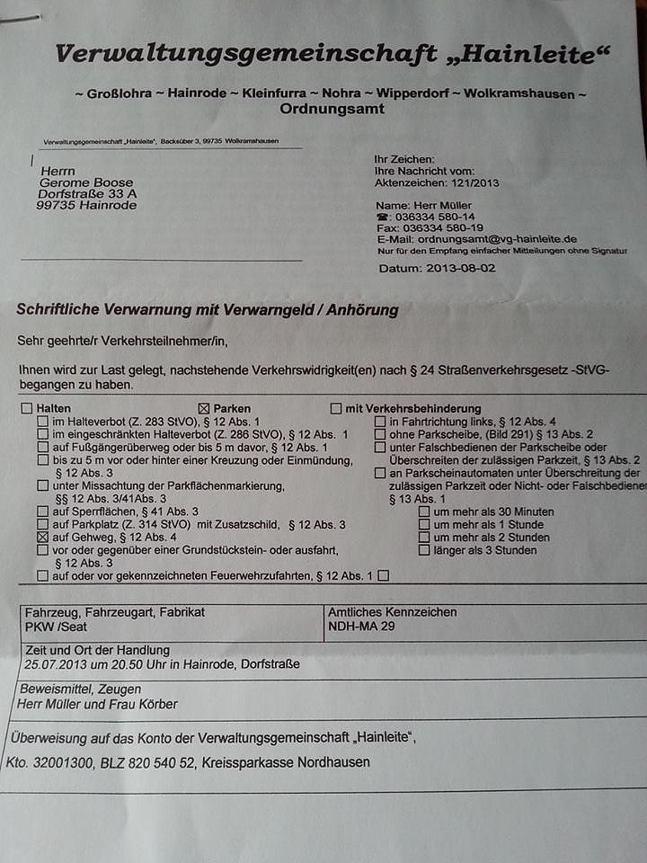 Liebe Redaktion der nnz, ich schicke hier auch einen Strafzettel der Verwaltungsgemeinschaft Hainleite, den ich am 25. Juni,, um 20.50.Uhr bekommen habe. Weil ich vor meinem Haus geparkt habe. So, heute stehen vor meinen Haus vier Fahrzeuge, die auf dem Gehweg vor meiner Tür parken. Aber wo ist das Ordnungsamt? Ich habe Fotos an das Ordnungsamt geschickt und gefragt wo sie sind, wenn man sie braucht.