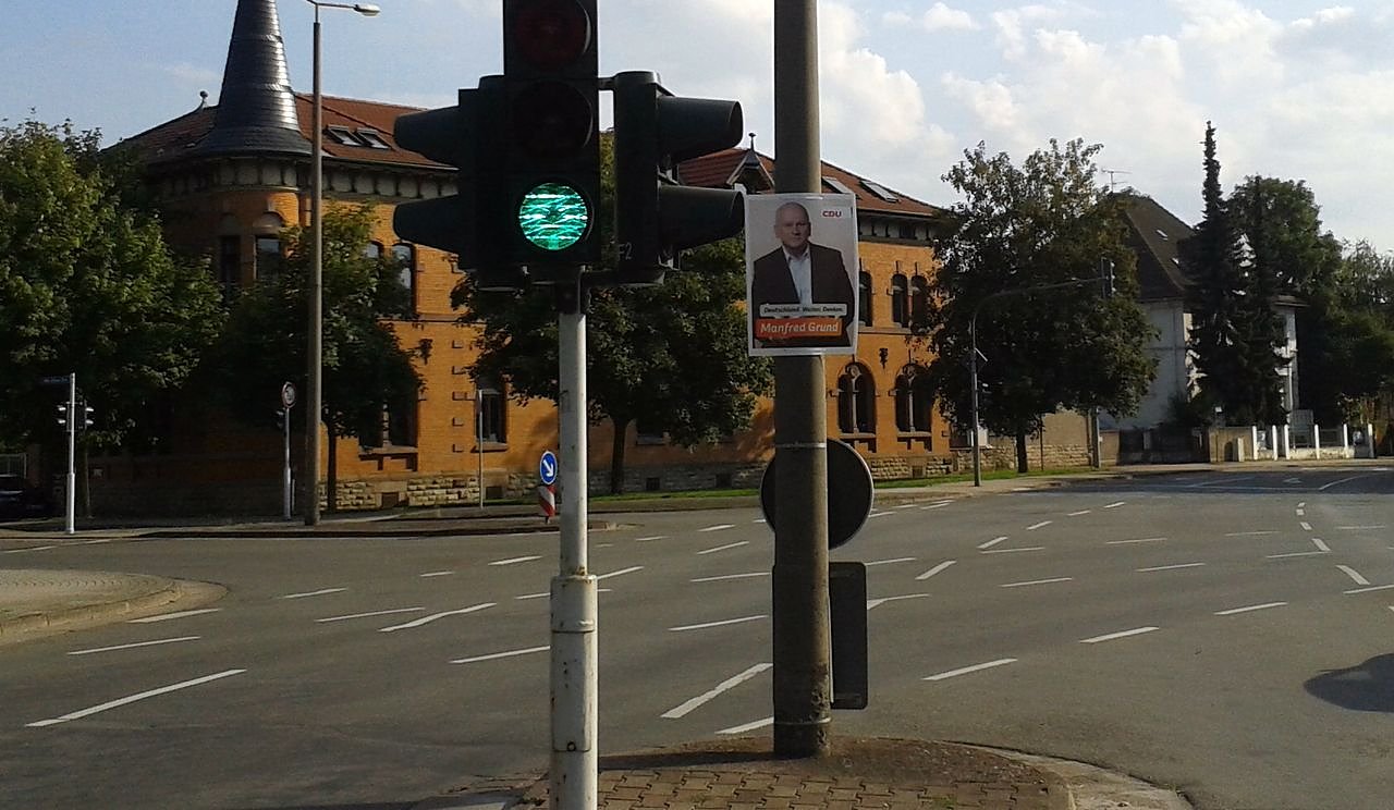 Für uns als Piratenpartei in Nordhausen ist das Plakate aufhängen Neuland. Darum haben wir versucht uns an die Vorschriften zu halten. Plakate dürfen nicht größer sein als A1, andere hängen welche auf die doppelt so groß sind. Plakate müssen 15 Meter Abstand von Kreuzungen haben. Andere hängen sie direkt in den Kreuzungsbereich (siehe Foto) .