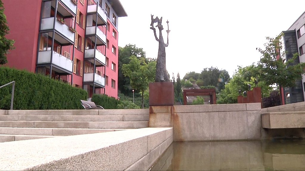 Die Wasserachse ist es heute, auf die wir aufkmerksam wurden. Sie wurde Anfang April 2004 euphorisch eröffnet. Was wurde da nicht alles hineininterpretiert. Nachzulesen ist das alles in der nnz. Und wie sieht es heute aus? Statt Wasservorhängen und Fontänen ziert eine Pfütze das architektonische Highlight.