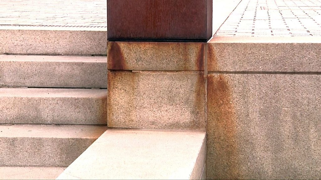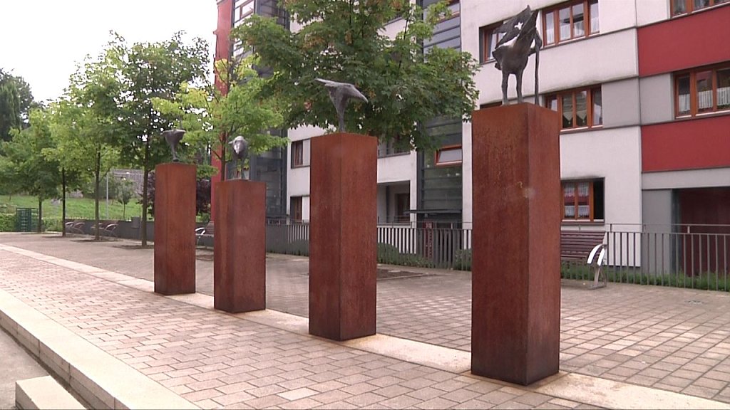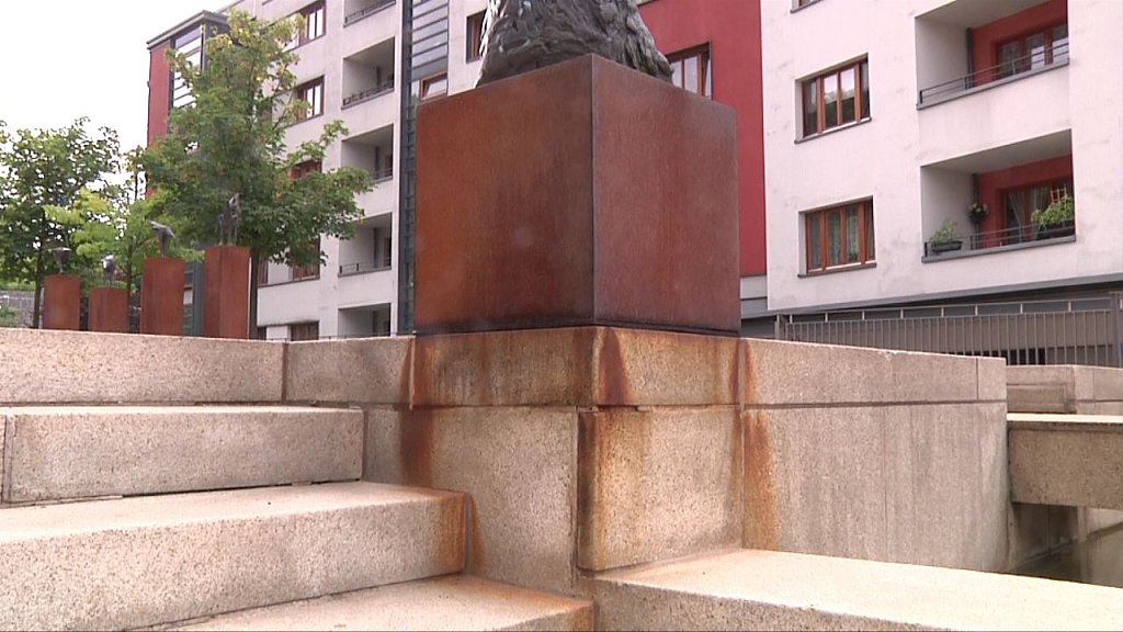 Wie damals üblich, setzten Architekten und Verwalter viel auf Stahl, der schon bei der Einweihung eher rostig statt einladend aussah. Was dieser Stahl derzeit an den hochwertigen Steinen anrichtet, ist auf den Fotos zu sehen. Die Bürgerwehr von Gerd Mackensen wacht vor sich hin und für den im Schiff fahrenden Hund ist Wasser eher dann zu erwarten, wenn Petrus sich erbarmt.